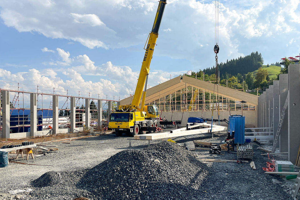 Die Sonne lacht am Urlaubsberg, doch unsere fleißigen Baustellen-Bienchen bauen eifrig weiter. Die Holzkonstruktion der neuen Reithalle wurde in den letzten Tagen aufgebaut und lässt uns bereits von Kinder-Reitstunden träumen, die wir dann auch ganzjährig bei jedem Wetter anbieten können. Im Winter heißt es außerdem "ab aufs Eis", denn die Hälfte der 40 x 20 m großen Halle soll dann zur überdachten Eislaufbahn werden. Was für ein besonderes Highlight im Winterurlaub! Wir freuen uns riesig auf Pferdeabenteuer und Rutschpartien bei bestem Ausblick.
