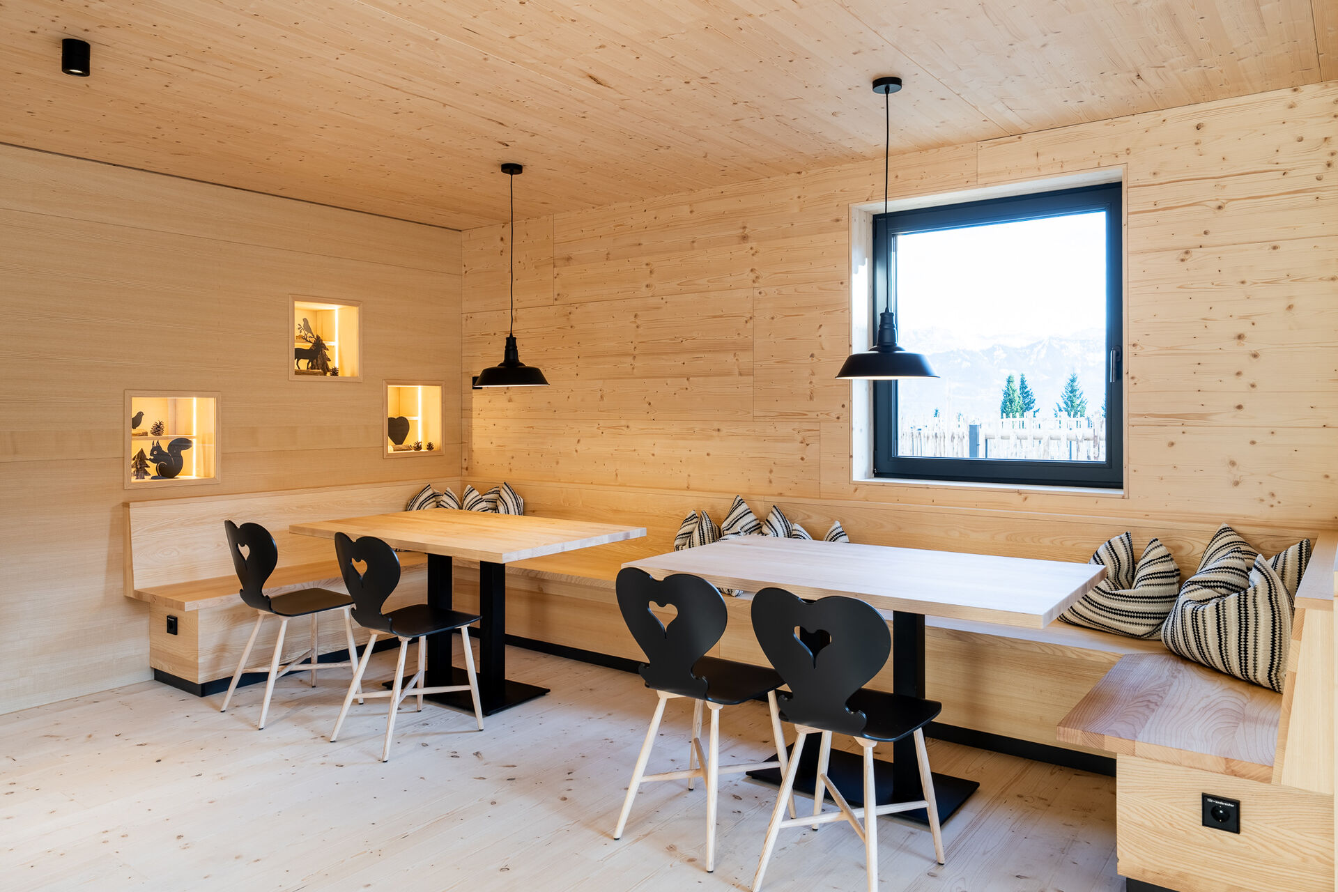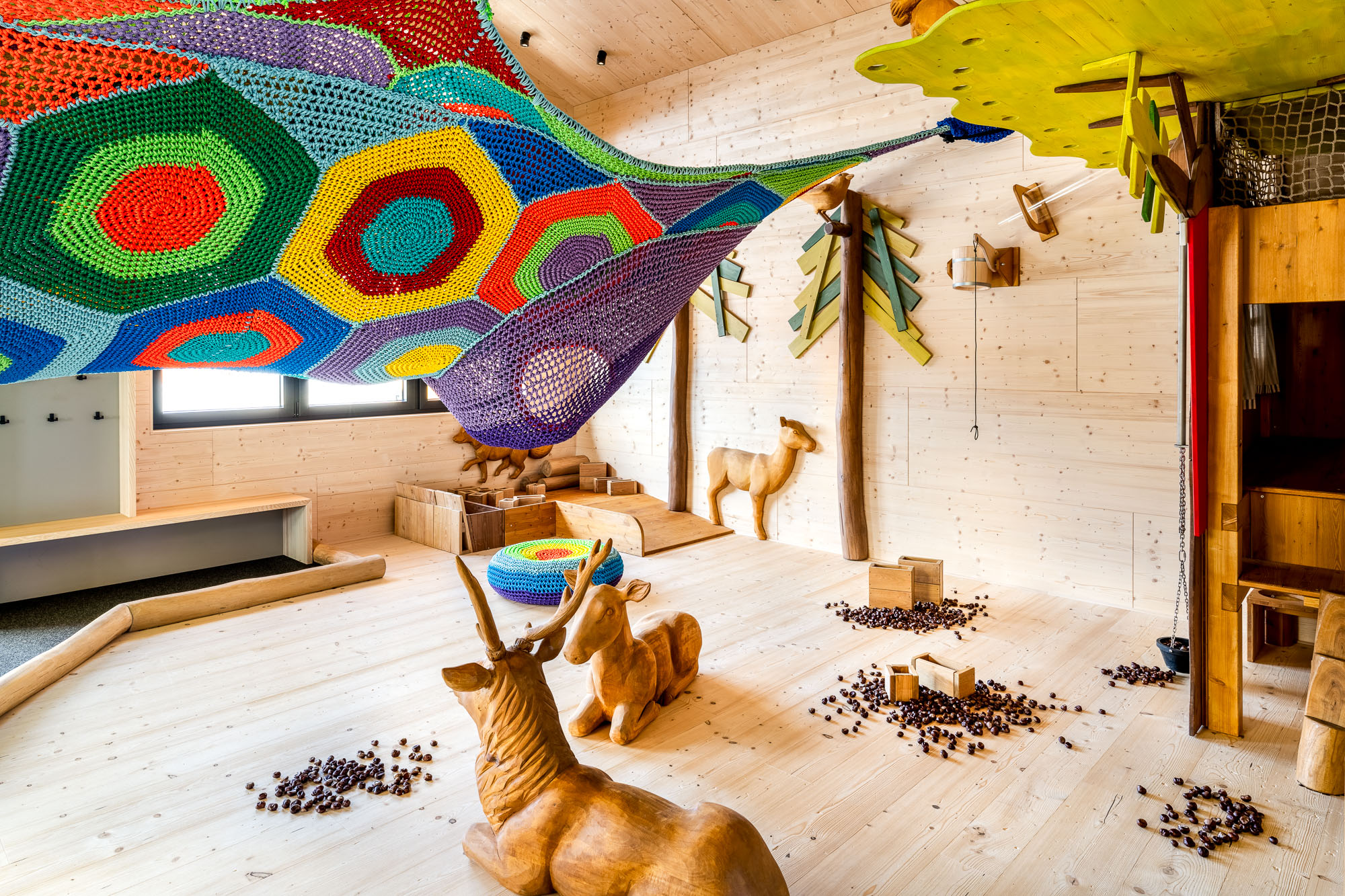 Hier kommt etwas für die jüngsten Gäste – im beheizten Indoor-Spielbereich wartet ein wunderschön gestalteter Holzspielplatz mit zahllosen Kastanien für die Kleinsten. Kleine Kletteräffchen verstecken sich so lange im Kletternetz. Währenddessen genießen Mama und Papa einen leckeren Cappuccino in der gemütlichen Stube