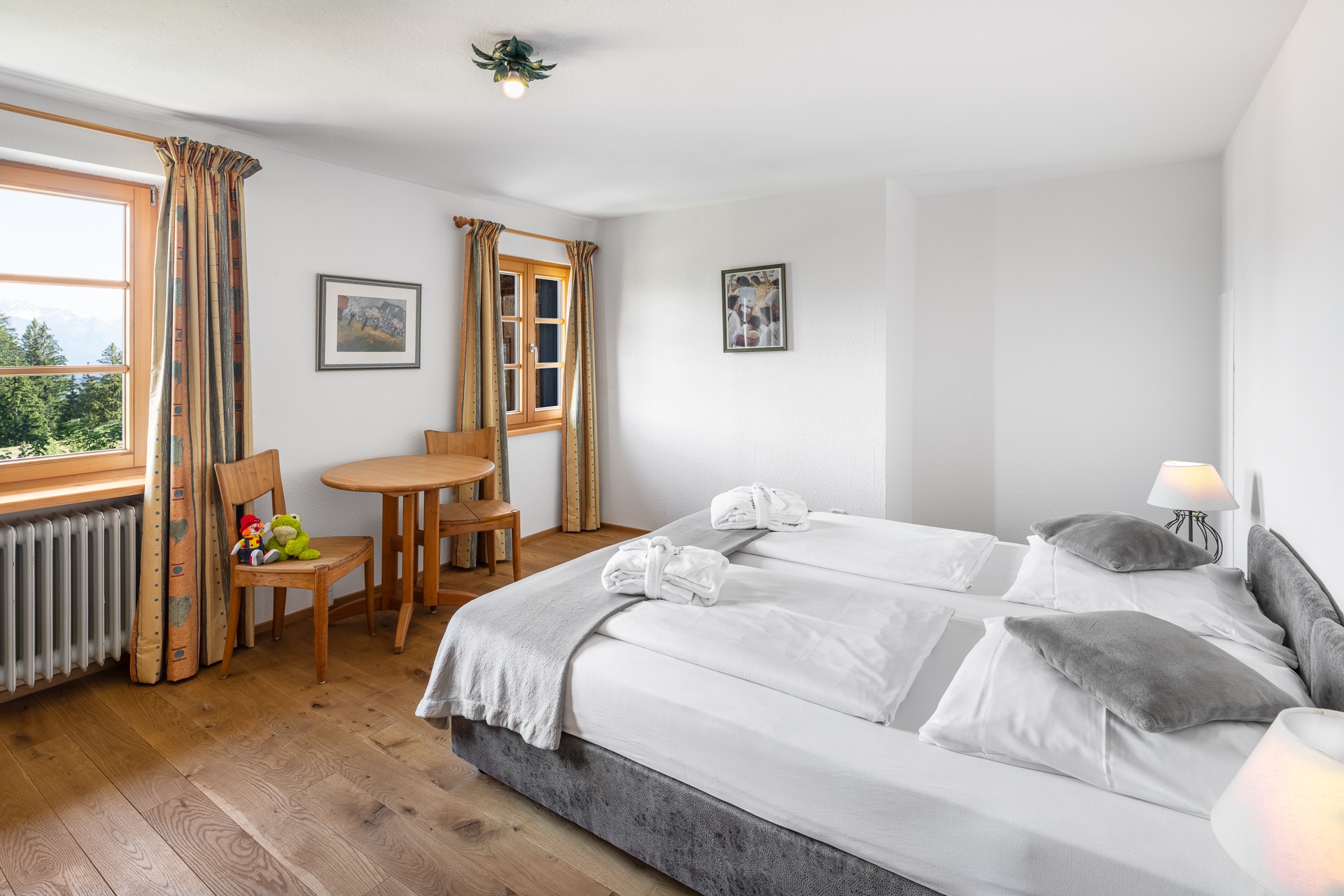 Großzügiges Familien-Chalet über zwei Stockwerke in direkter Nähe zu Streichelzoo und Reitstall. Mit ca. 150 m Entfernung vom Hotel weit genug weg um echter Familien-Rückzugsort zu sein, gleichzeitig nahe genug um jederzeit unkompliziert die komplett Hotel-Infrastruktur nutzen zu können.Eigene Garage, unglaublich großzügiges Wohnzimmer, Esszimmer, zwei Schlafzimmer mit Doppelbett und jeweils genügend Platz für ein zusätzliches Gitterbett, Kinderzimmer mit Stockbett und genügend Platz für ein zusätzliches Gitterbett. Rustikal-gemütliche Einrichtung mit individueller Möblierung.