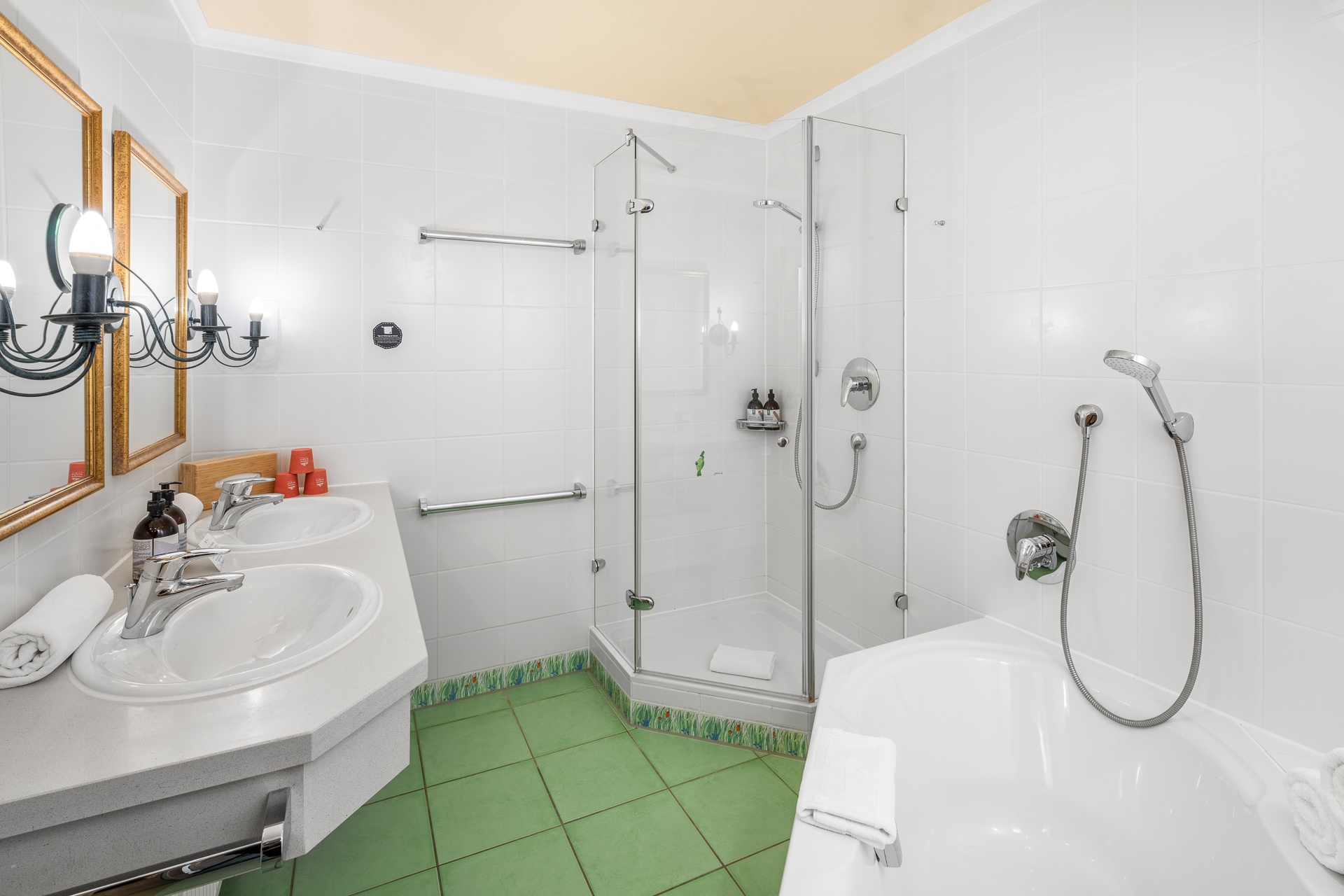 - Helles, freundliches Badezimmer mit Dusche und Wanne. Lustige Fliesen mit Janosch-Motiven.
