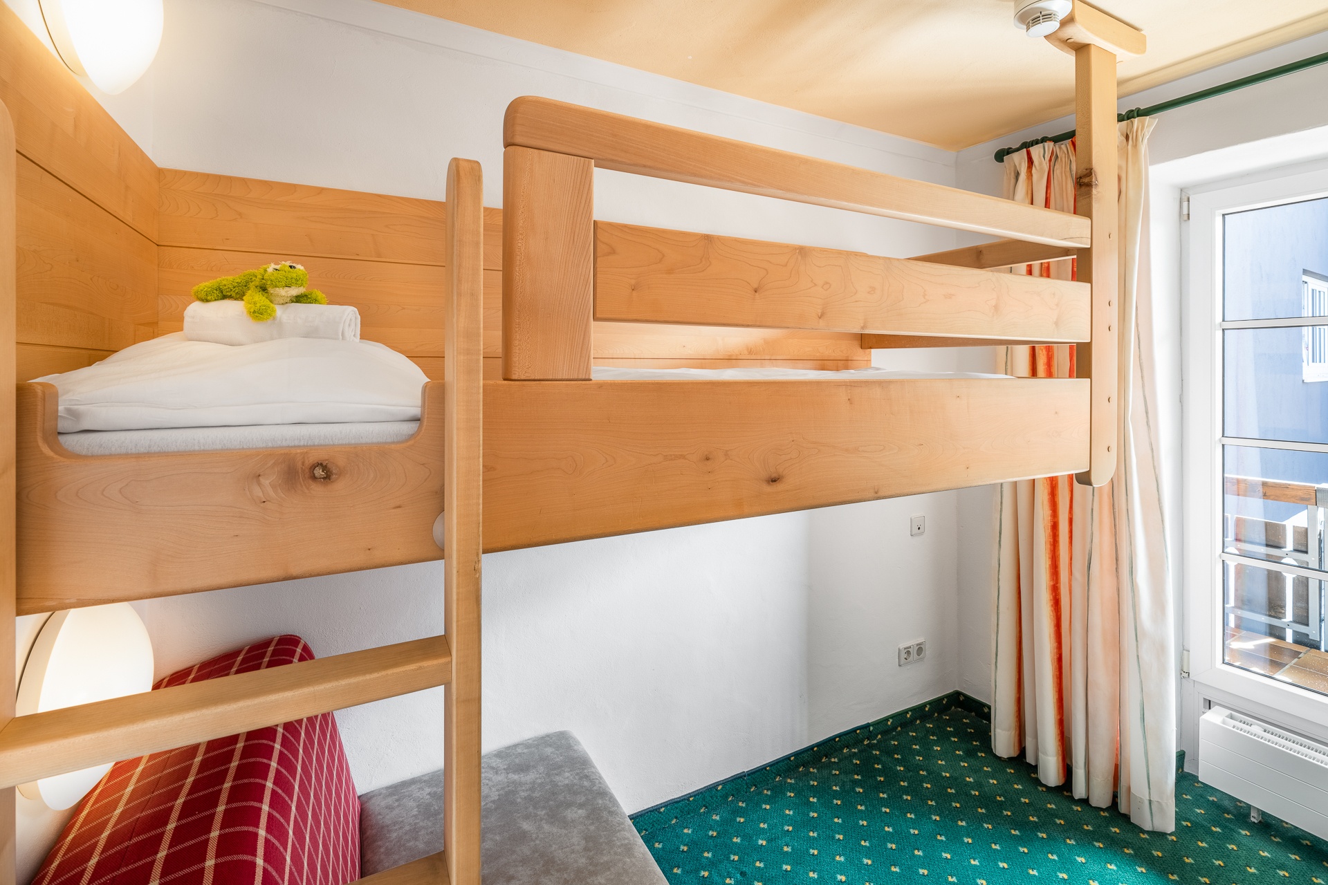 Familiensuite mit gemütlichem Wohn-Schlafraum für die Eltern. Kinderzimmer mit Hochbett und darunter liegendem ausziehbarem Schlafsessel sowie Platz für ein zusätzliches Gitterbettchen. Eingerichtet mit freundlichen hellen Fichten-Einbaumöbeln.