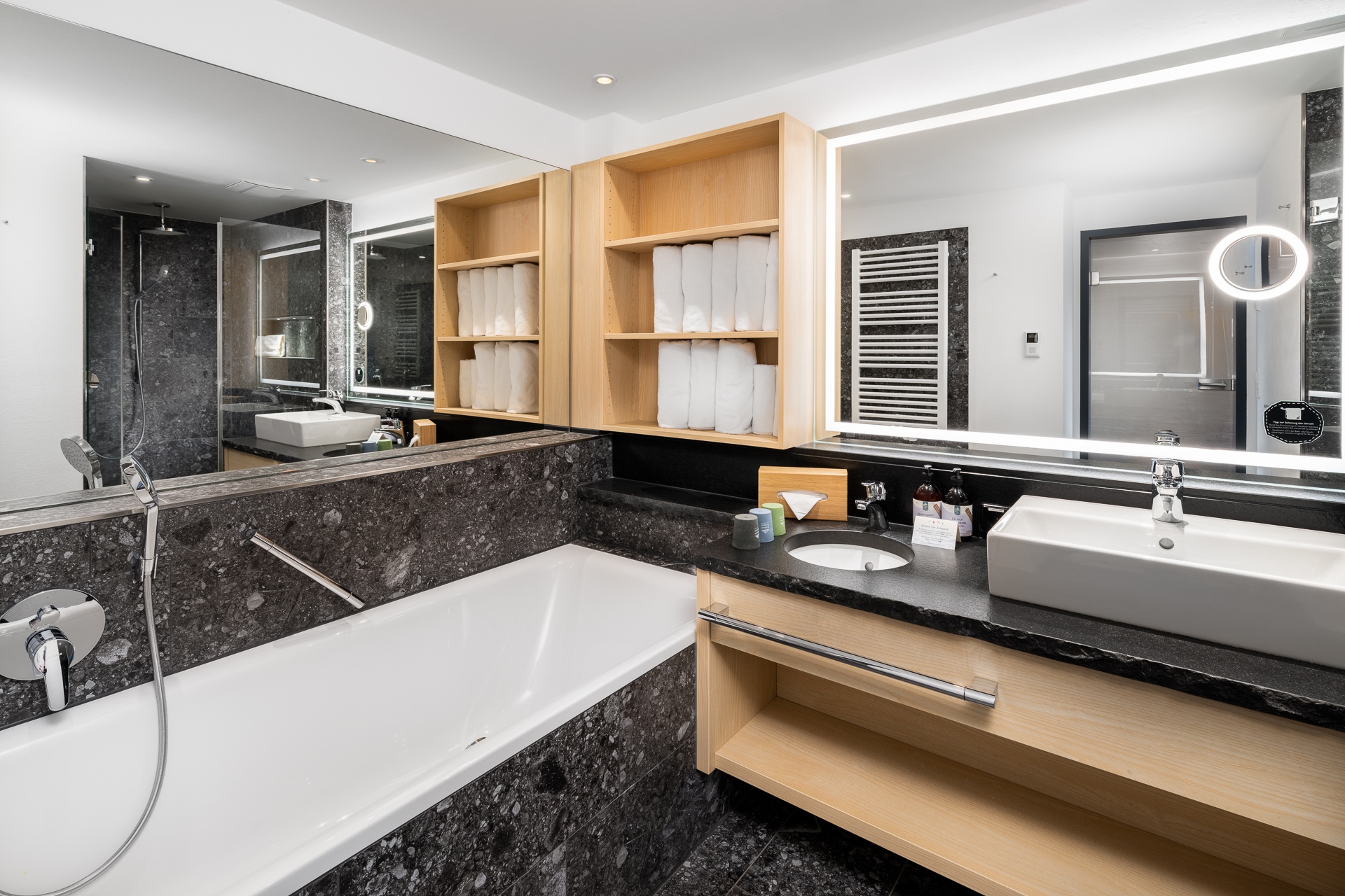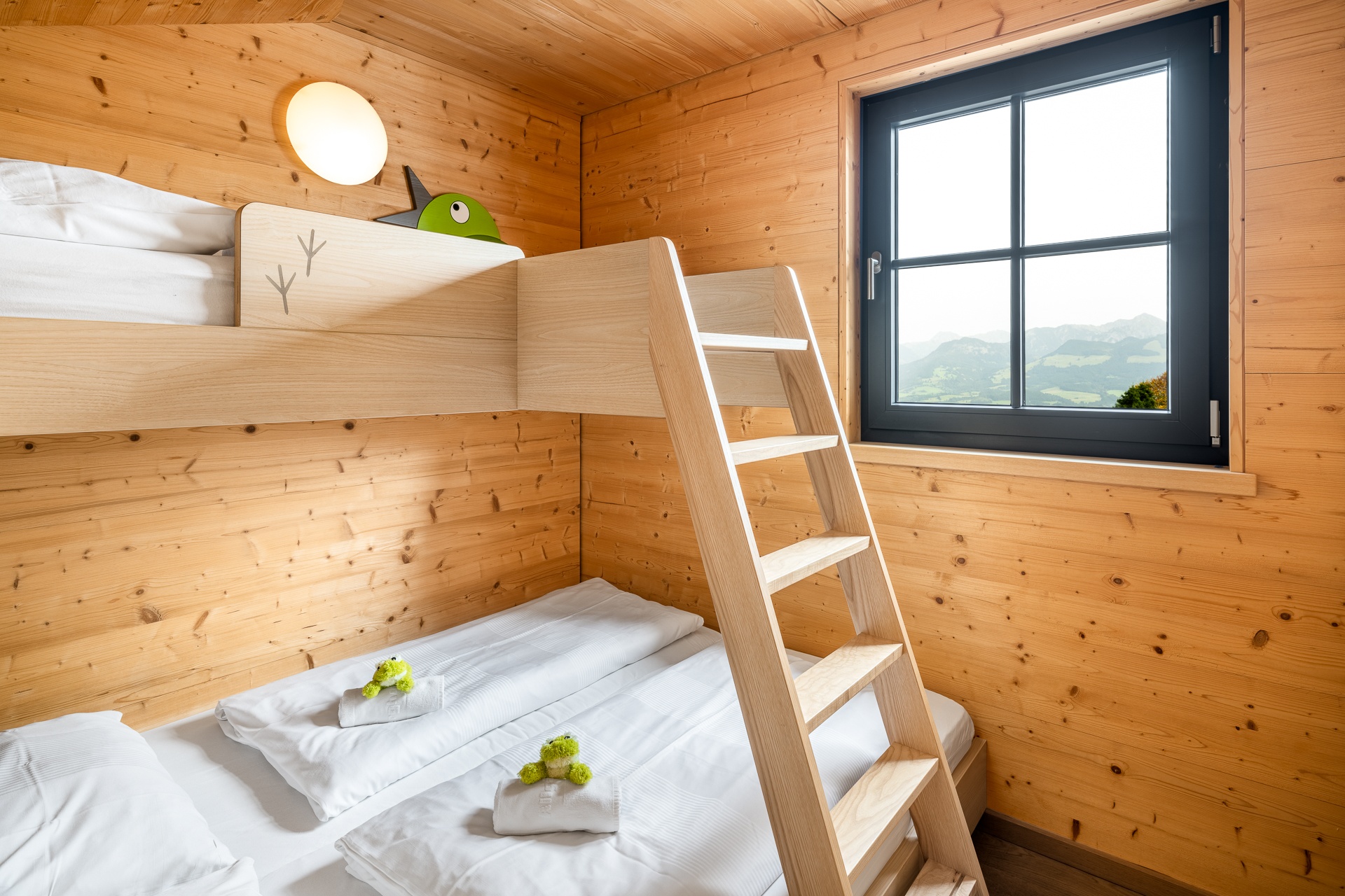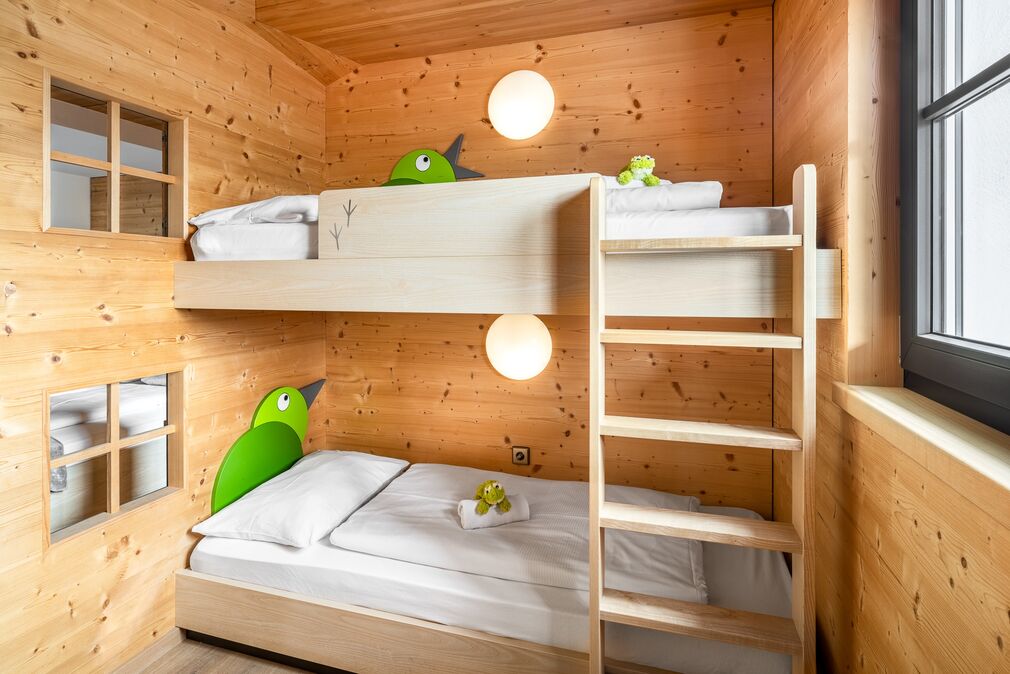 Familiensuite mit großzügigem Wohn-Schlafraum für die Eltern. Ein Kinderzimmer mit kuscheligem Spielwiesenstockbett. Zweites Kinderzimmer mit Stockbett. Stillvoll-gemütliche Einrichtung mit Sichtholzwänden und Einbaumöbeln aus Esche. Edle Stoffe mit heimeligen Karos.