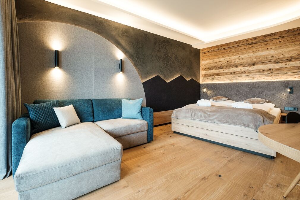 Familiensuite mit großzügigem Wohn-Schlafraum für die Eltern. Ein Kinderzimmer mit kuscheligem Spielwiesenstockbett und genügend Platz für ein zusätzliches Gitterbettchen. Stilvolle Einrichtung mit edler Wandgestaltung. Warmes Altholz, freundliche Fichtenmöbel. Stoffe in natürlichen Farben.