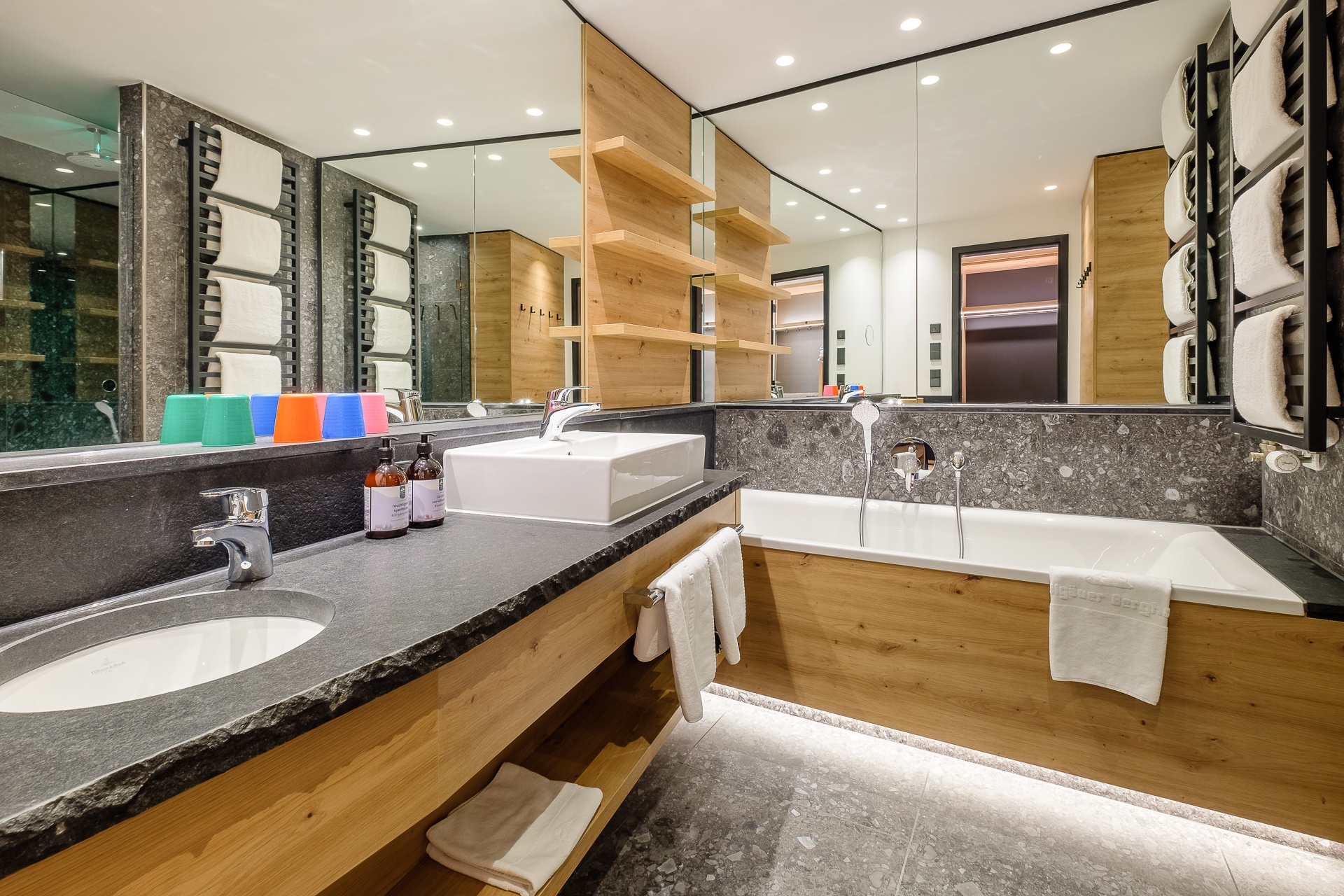 - Stylisches Badezimmer mit Natursteinwaschtisch, Dusche und Wanne.