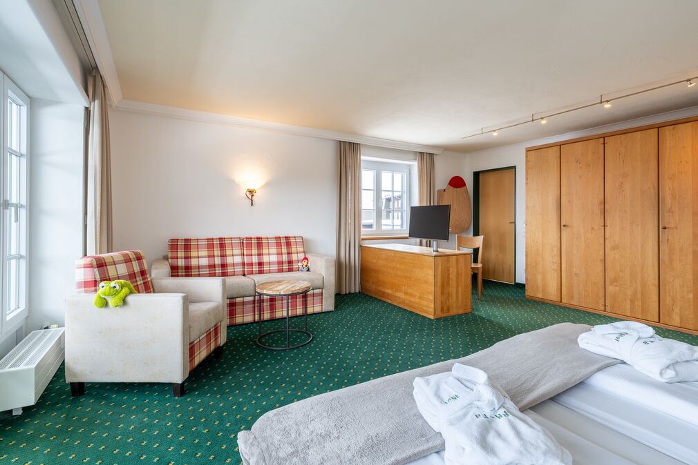 Familiensuite mit gemütlichem Wohn-Schlafraum, Ausziehsofa und genügend Platz für ein zusätzliches Gitterbettchen. Eingerichtet mit ehrlichen Vollholzmöbeln aus Buche.