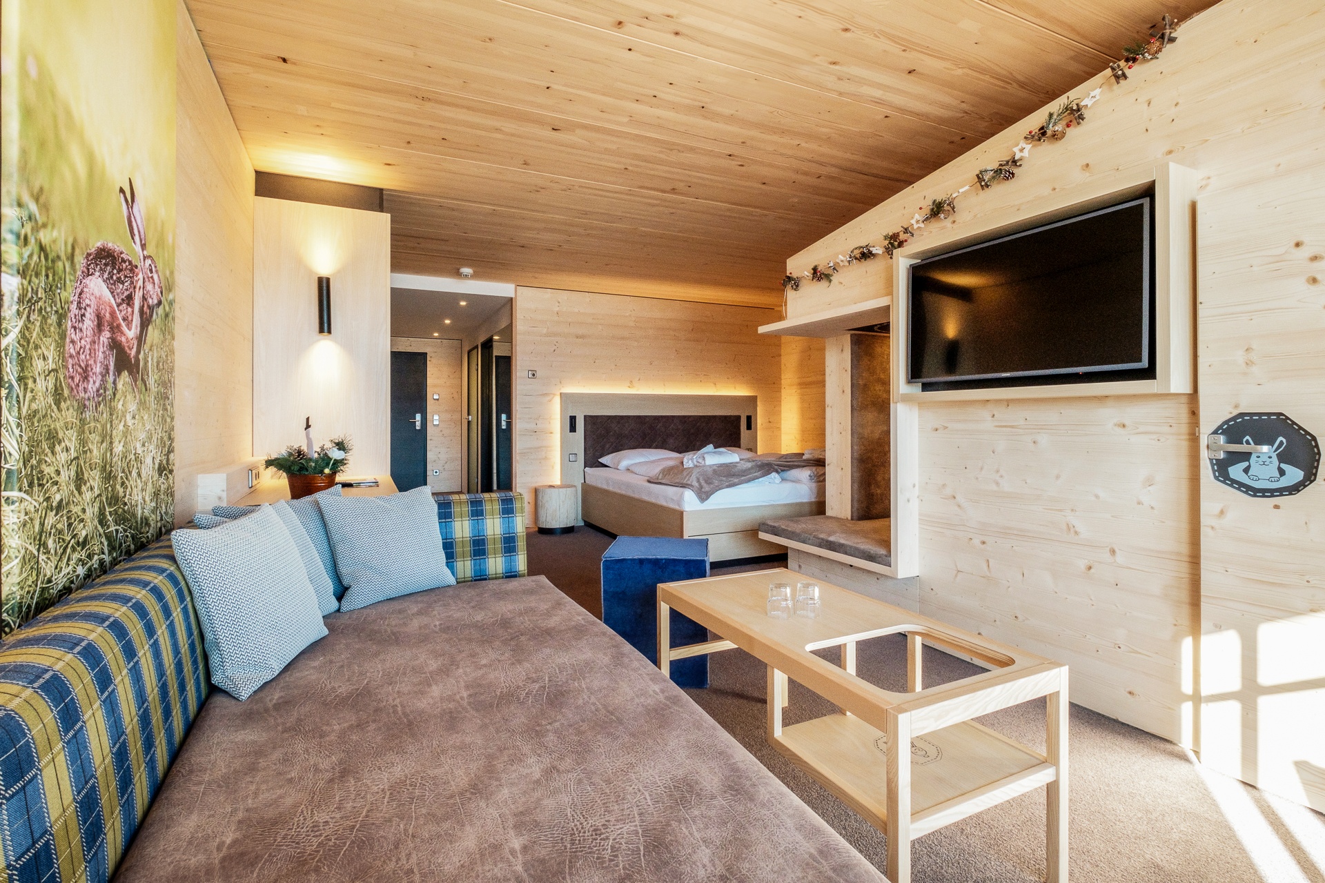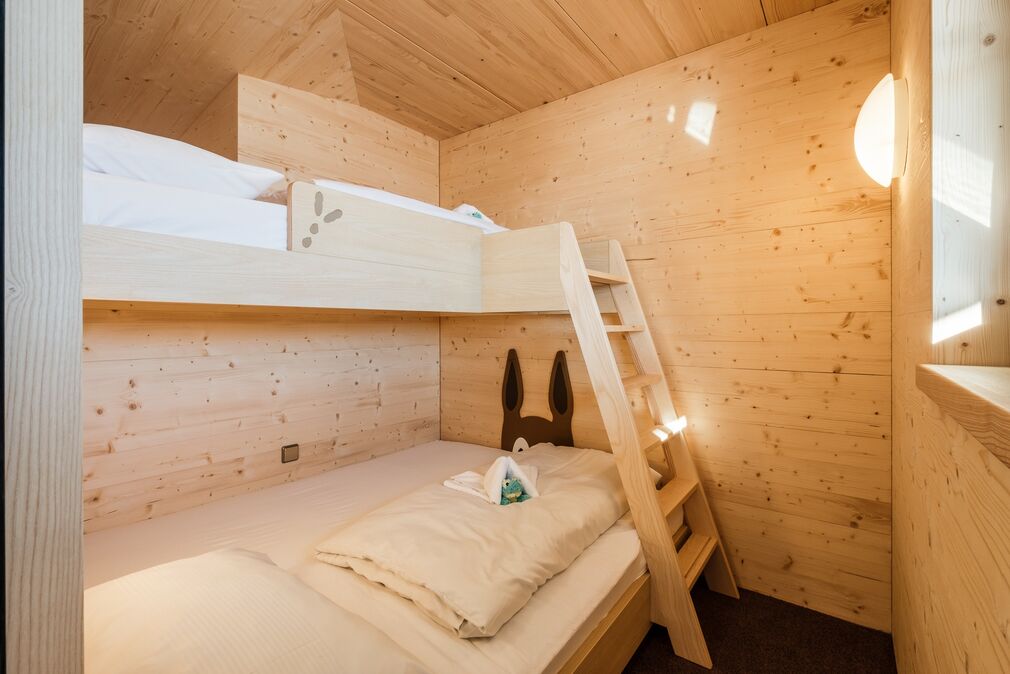 Familiensuite mit gemütlichem Wohn-Schlafraum für die Eltern. Kinderzimmer mit kuscheligem Spielwiesenstockbett. Stillvoll-gemütliche Einrichtung mit viel Sichtholzwänden und Einbaumöbeln aus Esche. Edle Stoffe mit heimeligen Karos.
