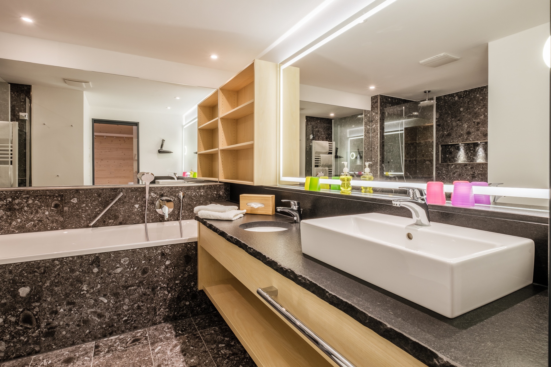 - Stylisches Badezimmer mit Natursteinwaschtisch, Wanne und Dusche.
