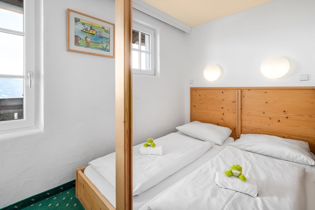Große Familiensuite mit gemütlichem Wohn-Schlafraum für die Eltern. Kuscheliges Kinderzimmer mit Spielwiesenbett. Eingerichtet mit freundlichen hellen Fichten-Einbaumöbeln.