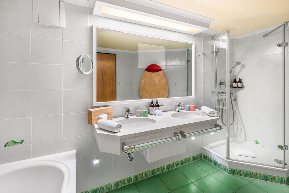 - Helles, freundliches Badezimmer. Lustige Fliesen mit Janosch-Motiven, Dusche, Wanne.
