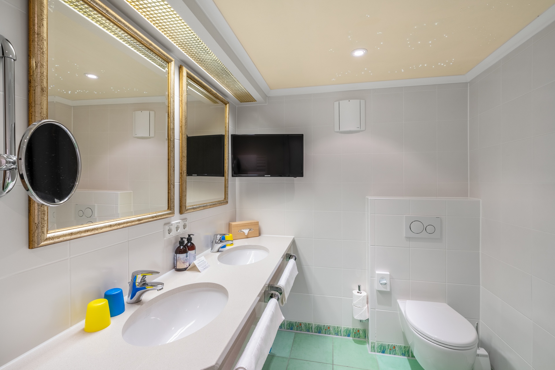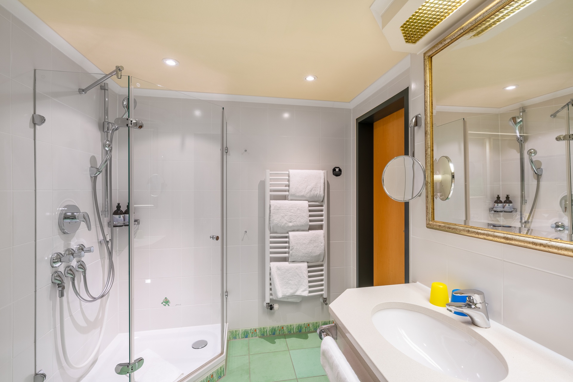 - Helles, freundliches Badezimmer. Lustige Fliesen mit Janosch-Motiven, Dusche.