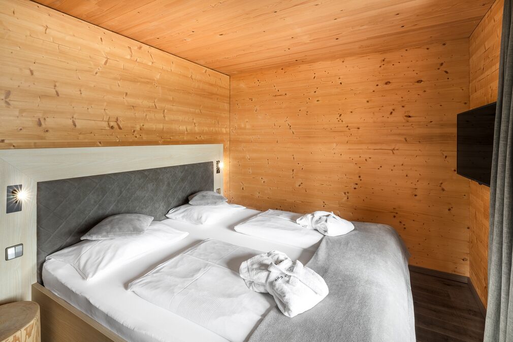 Diese Familiensuite verfügt über ein separates Wohnzimmer mit Eckbelichtung sowie ein Schlafzimmer mit Doppelbett für die Eltern. Ein Kinderzimmer mit kuscheligem Stockbett. Zweites Kinderzimmer mit Einzelbett. Stillvoll-gemütliche Einrichtung mit Sichtholzwänden und Einbaumöbeln aus Esche. Edle Stoffe mit heimeligen Karos.