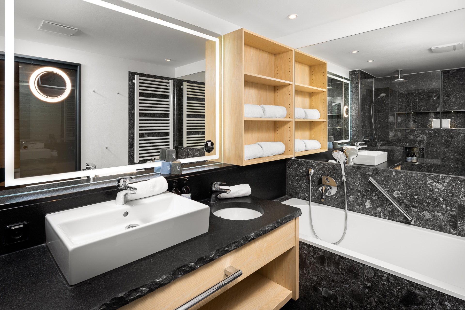 - Stylisches Badezimmer mit Natursteinwaschtisch, Dusche und Wanne.