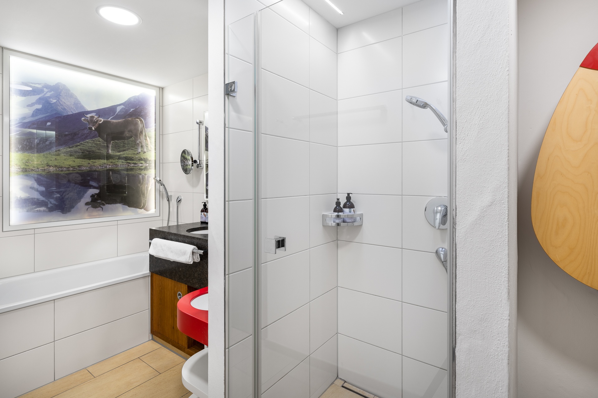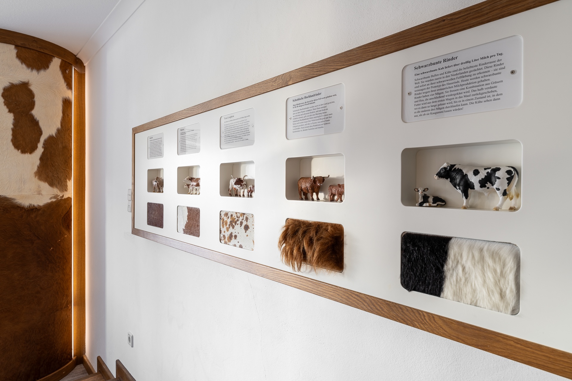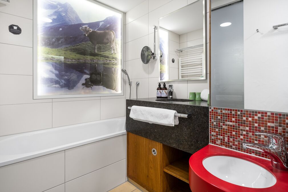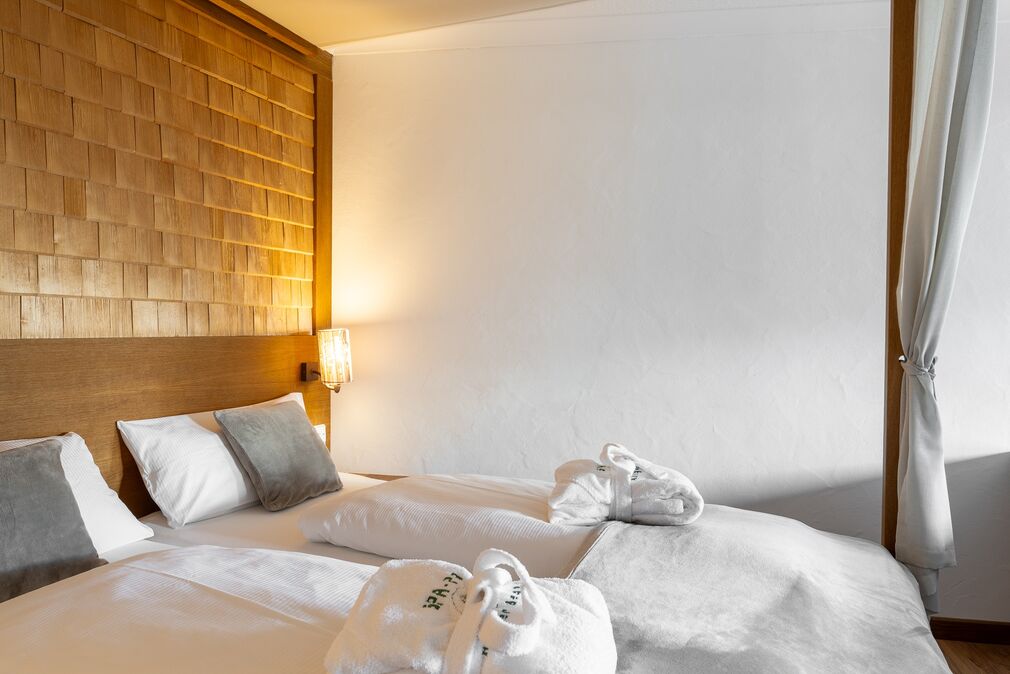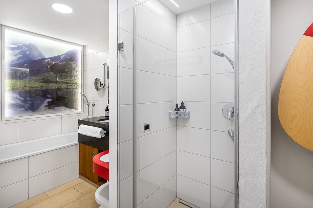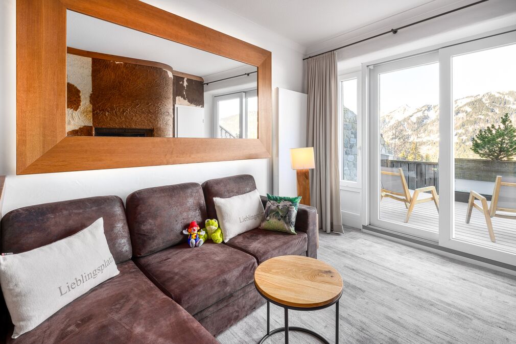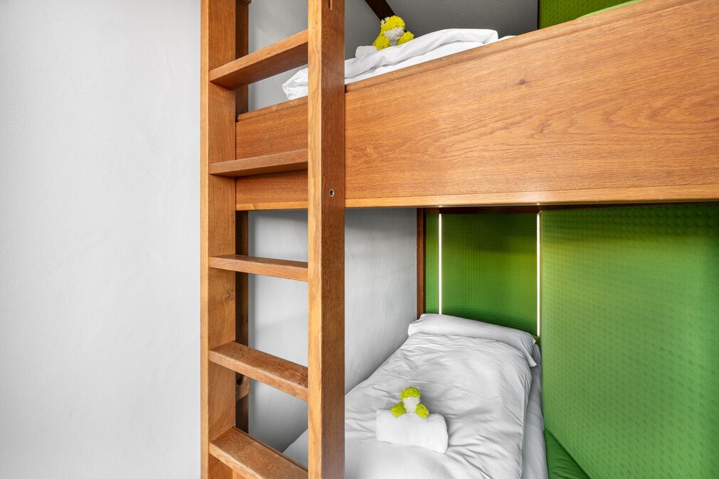 Pfiffig-individuell gestaltete Familiensuite mit gemütlichem Wohn-Schlafraum für die Eltern. Im kuscheligen Kinderzimmer ein Stockbett mit Rausfallschutz auf drei Seiten. Originelle Kuh-Details, Fellapplikationen und Eichen-Schreinermöbel geben dieser Familiensuite eine ganz besondere Wohlfühl-Atmosphäre.