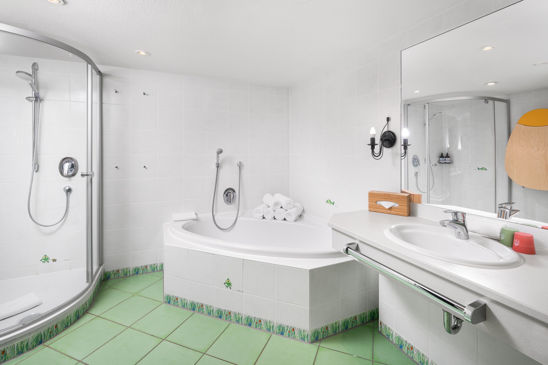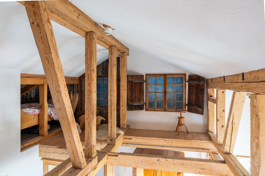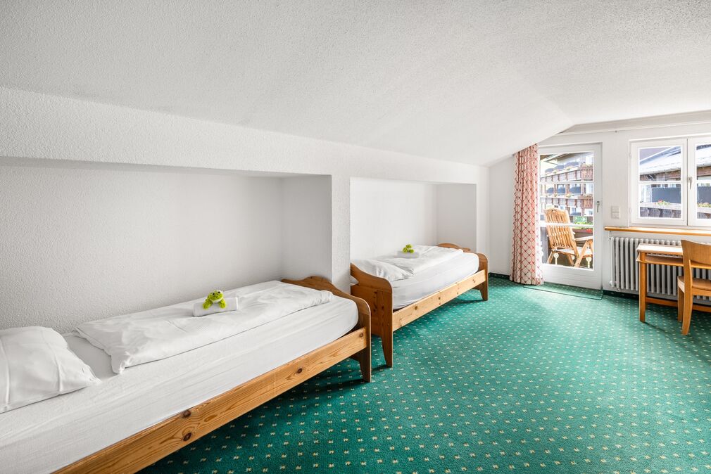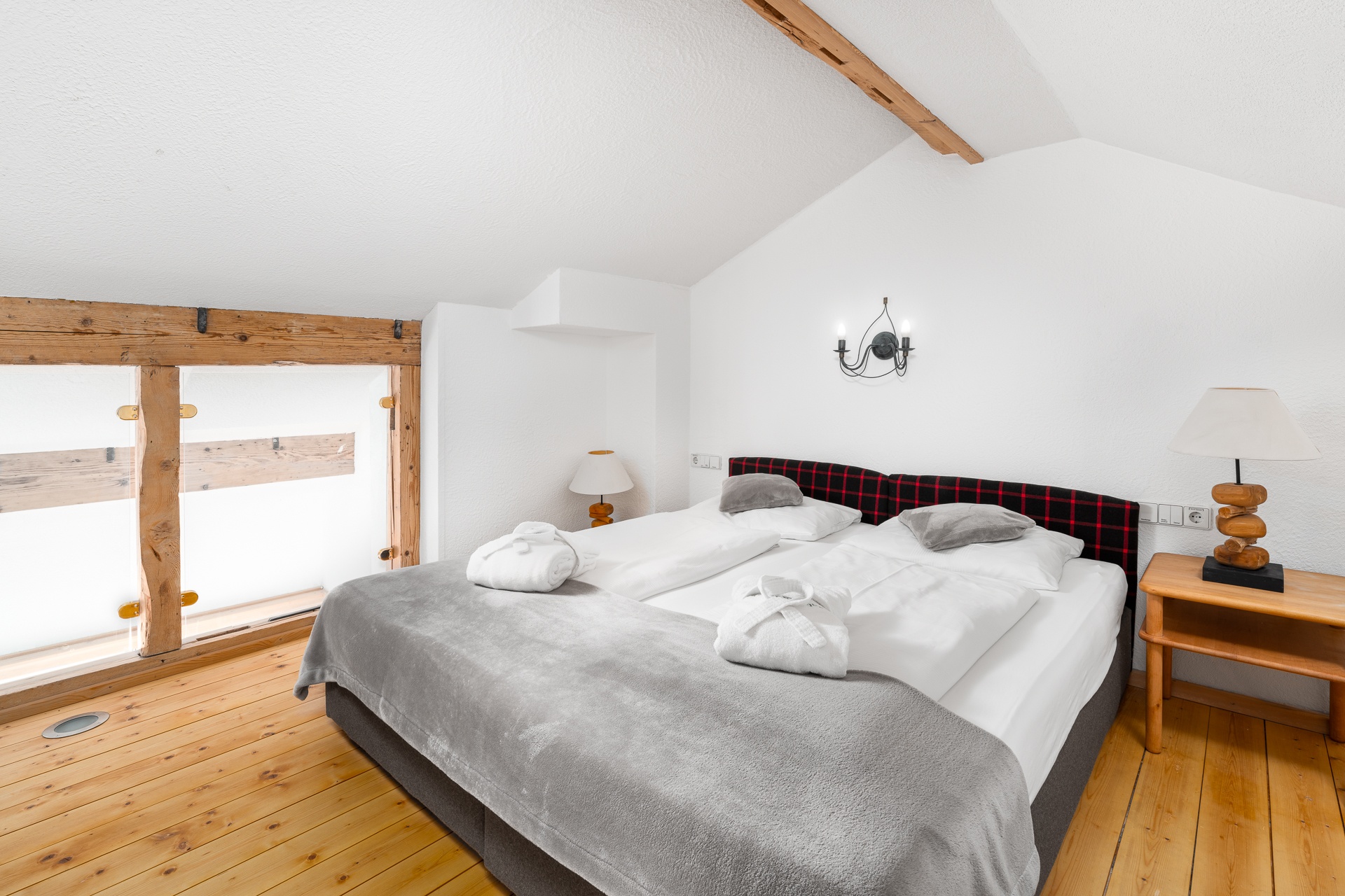 Äußerst großzügige Familiensuite. Wohnzimmer mit offener Empore auf der sich ein Doppelbett befindet. Kinderzimmer mit zwei Einzelbetten und ausreichend Platz für ein zusätzliches Gitterbettchen. Weiteres Schlafzimmer mit Doppelbett und ausreichend Platz für ein zusätzliches Gitterbettchen. Gemütliche und individuelle Einrichtung.