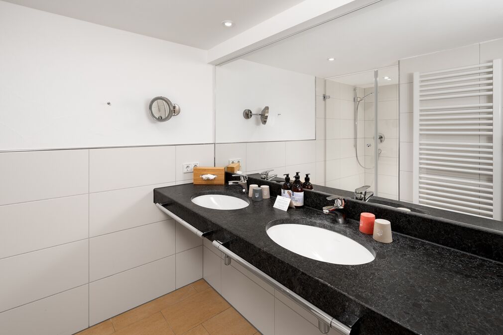 - Helles, freundliches Badezimmer mit Natursteinwaschtisch und Dusche.