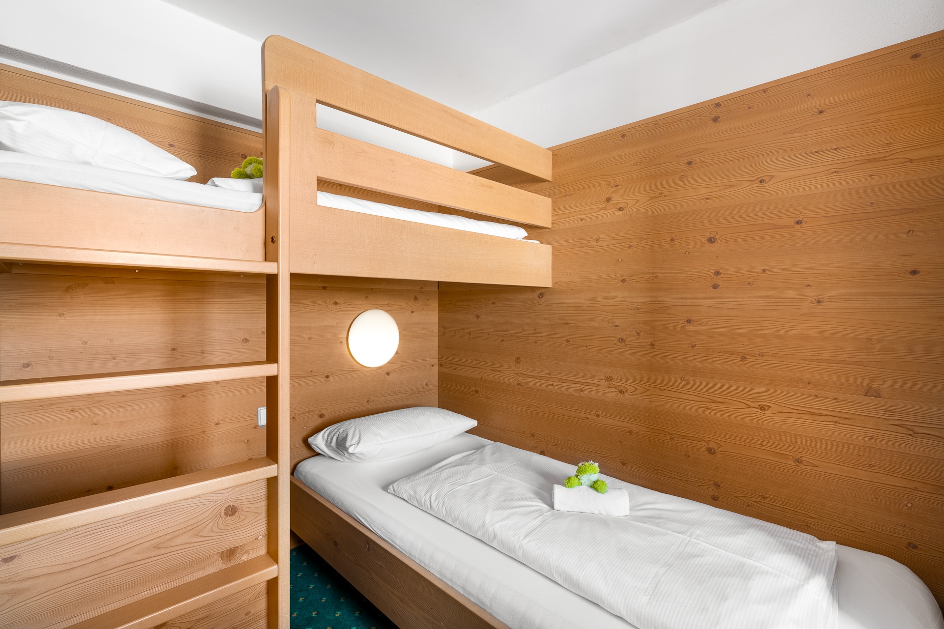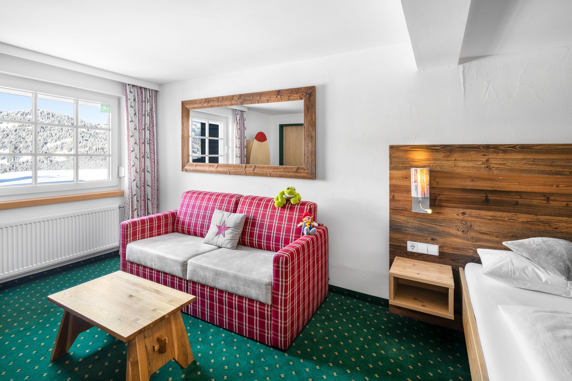 Familiensuite mit gemütlichem Wohn-Schlafraum. Kinderzimmer mit Über-Eck-Stockbett und genügend Platz für ein zusätzliches Gitterbettchen. Eingerichtet mit freundlich hellen Fichten-Einbaumöbeln, heimeligen roten Stoffen und gemütlicher Wandverkleidung in Altholz.