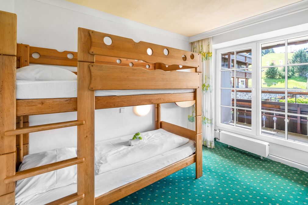 Großzügige Familiensuite mit Wohn-Schlafraum für die Eltern. Kinderzimmer mit Stockbett und ausreichend Platz für ein zusätzliches Gitterbettchen. Eingerichtet mit ehrlichen Vollholzmöbeln aus Buche.