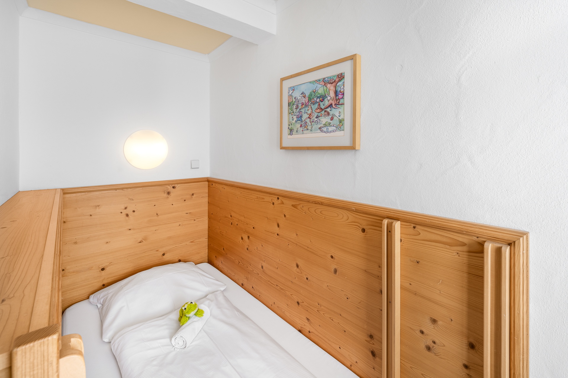 Familiensuite mit gemütlichem Wohn-Schlafraum für die Eltern. Kuscheliges Kinderzimmer mit Rausfallschutz auf drei Seiten und Schlafplatz für ein Kind. Eingerichtet mit freundlichen hellen Fichten-Einbaumöbeln.