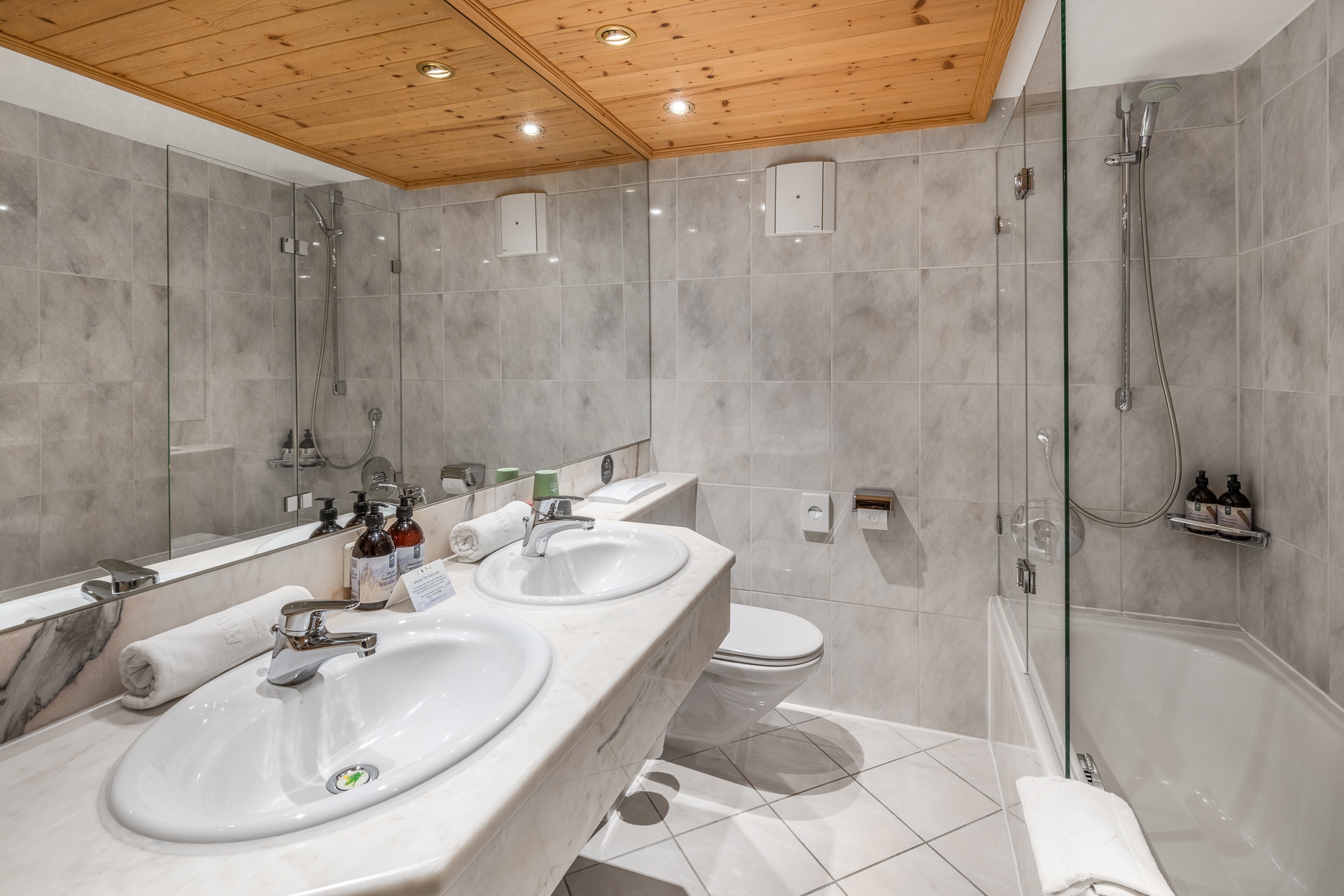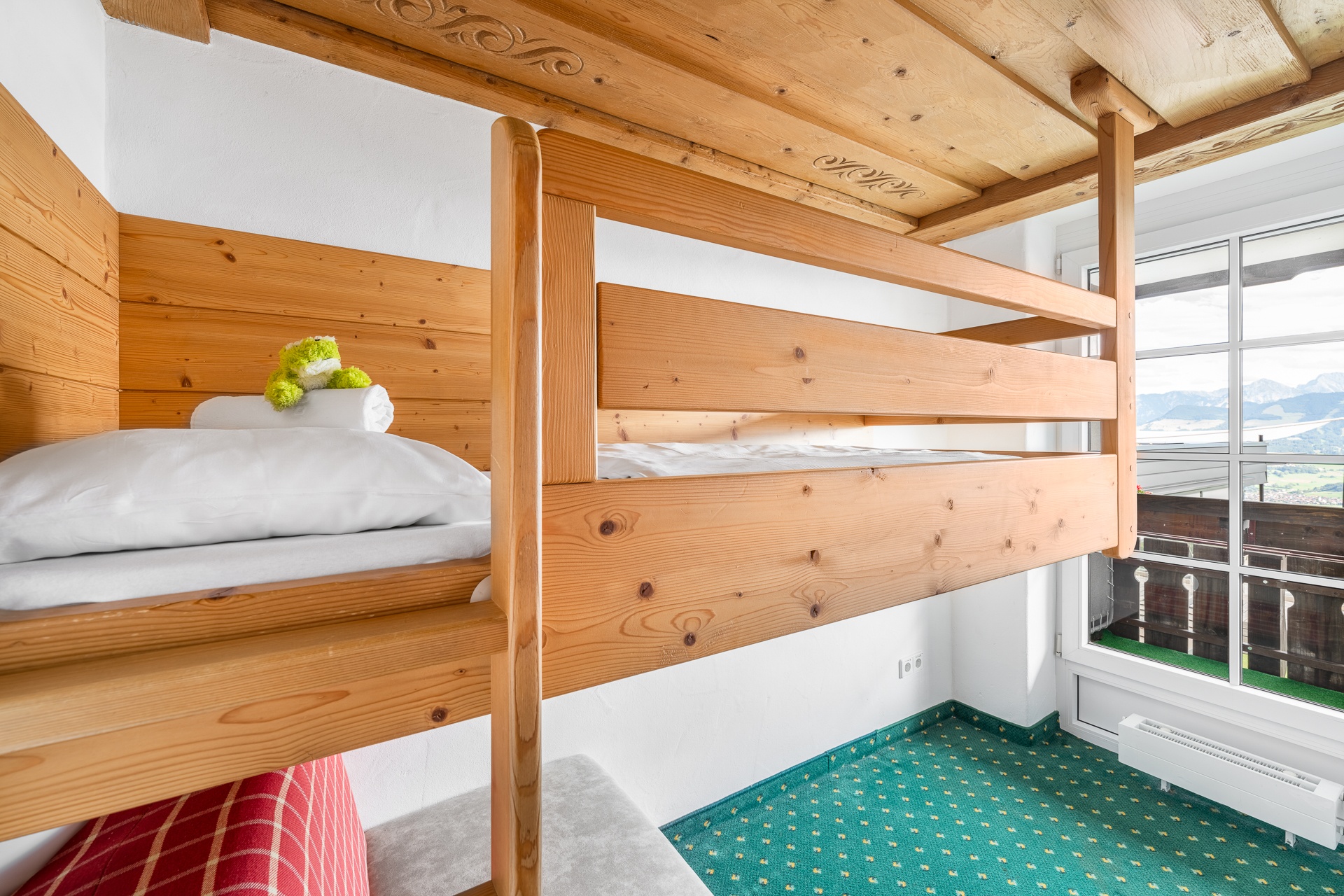 Familiensuite mit gemütlichem Wohn-Schlafraum für die Eltern. Kinderzimmer mit Hochbett und darunter liegendem ausziehbarem Schlafsessel sowie Platz für ein zusätzliches Gitterbettchen. Eingerichtet mit freundlichen hellen Fichten-Einbaumöbeln.