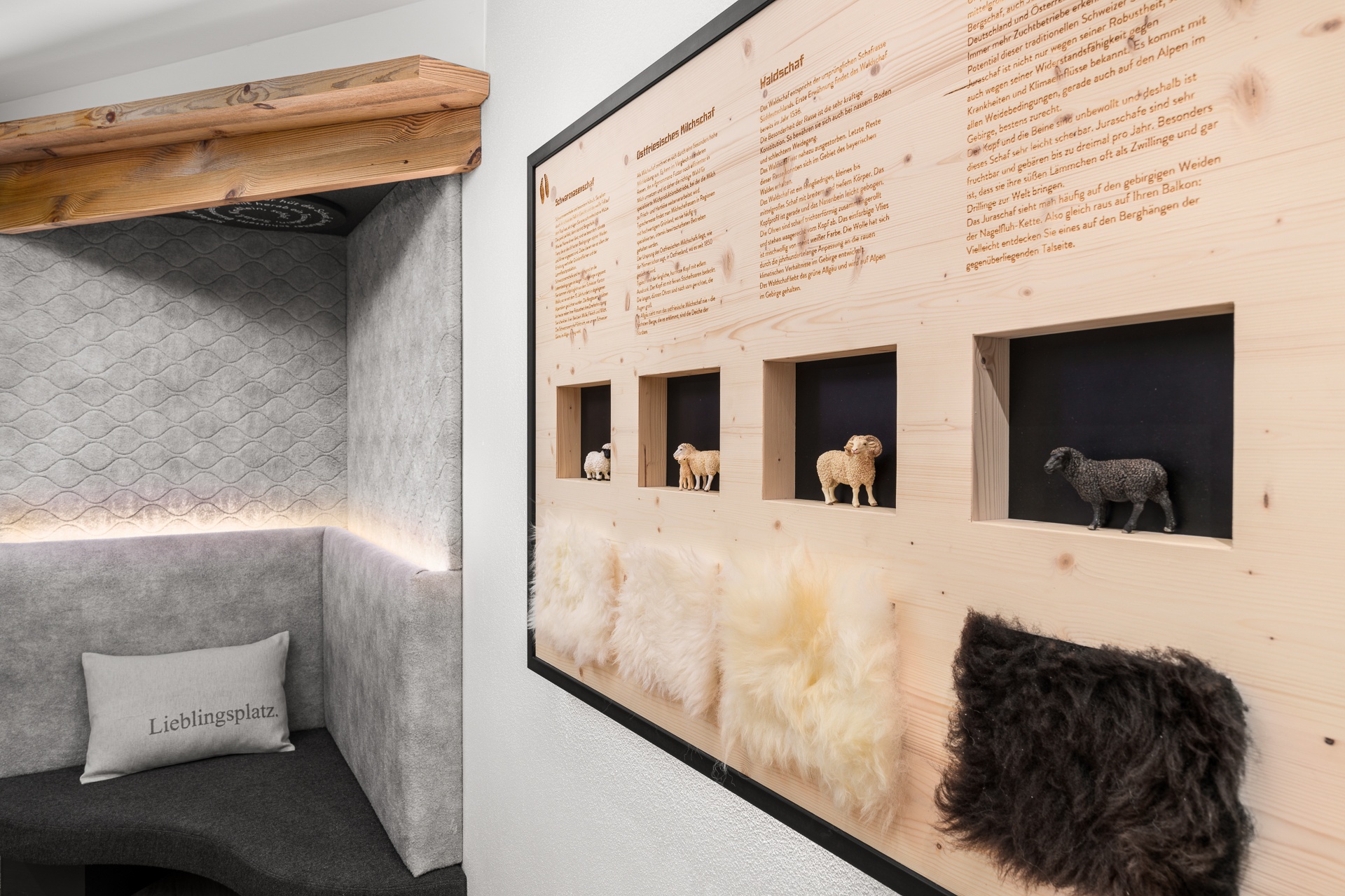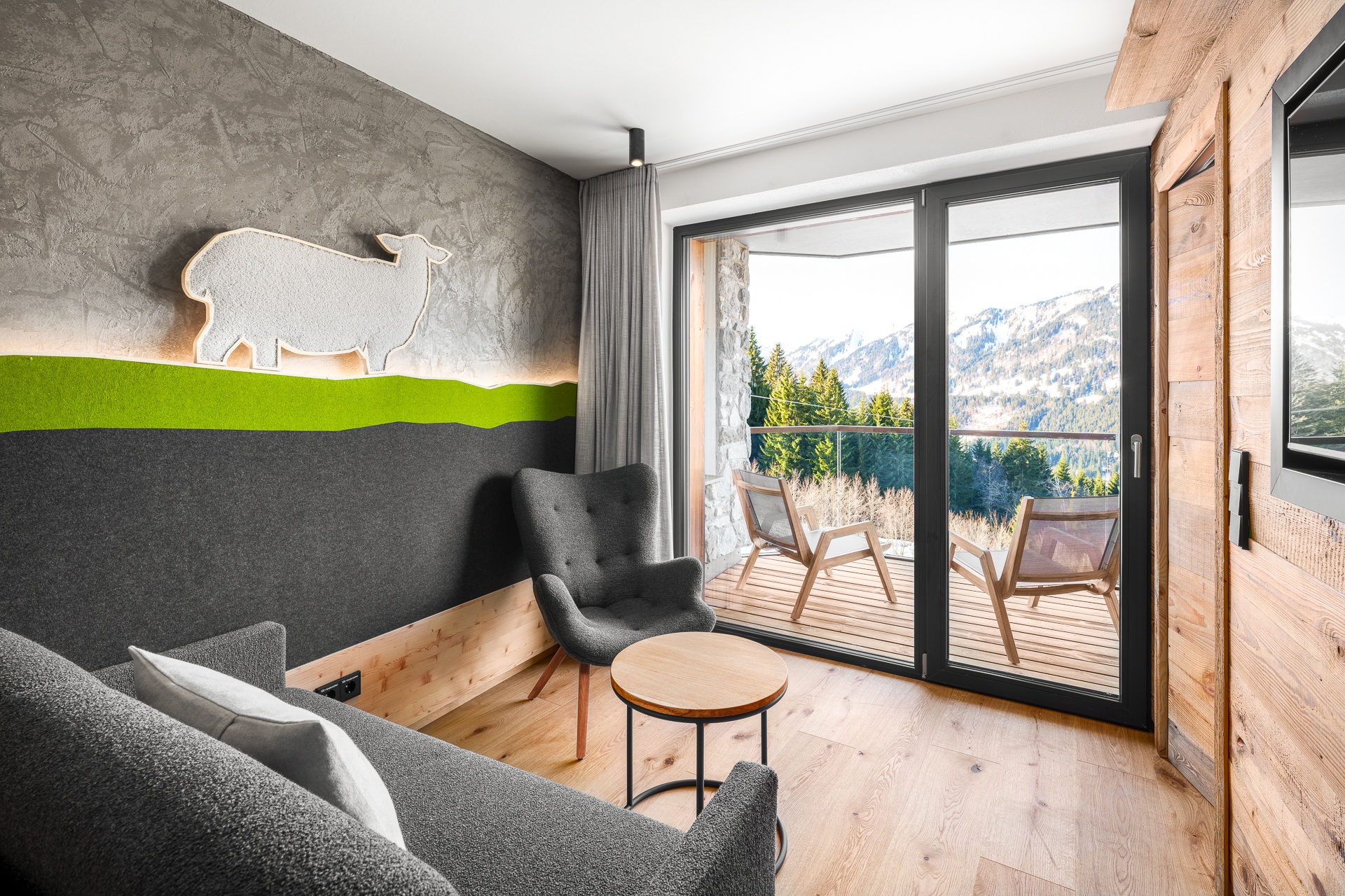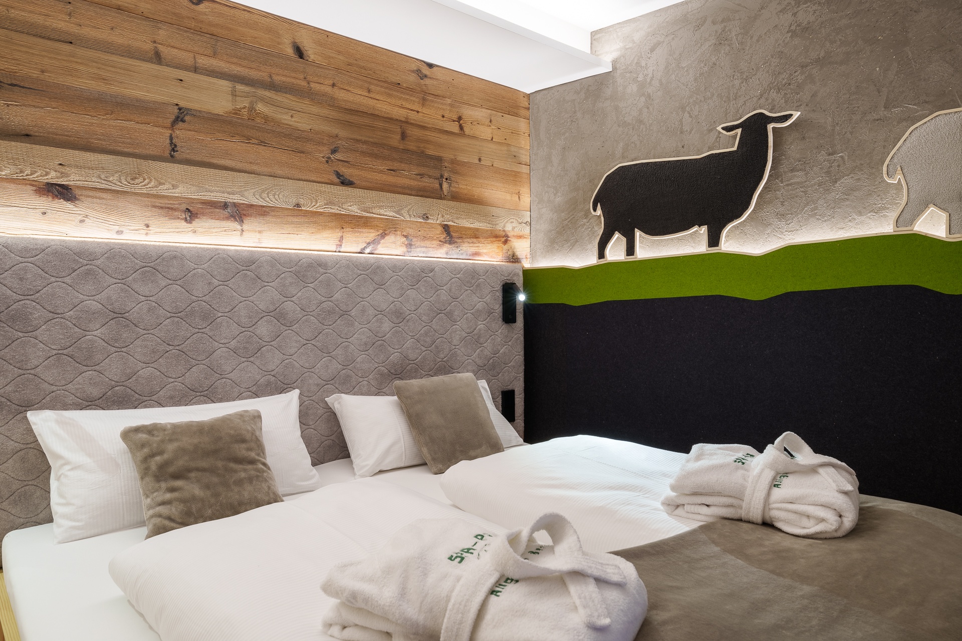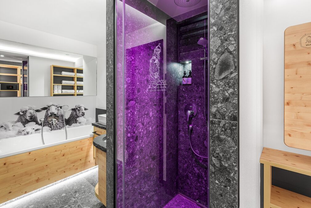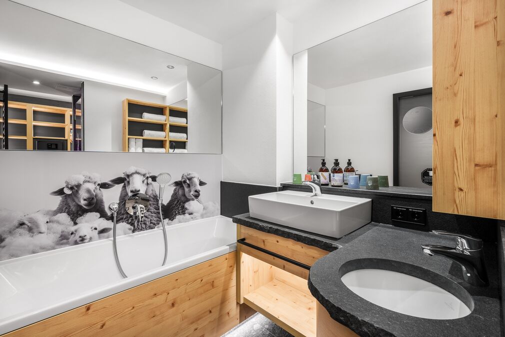 Pfiffig-individuell gestaltete Familiensuite mit gemütlichem Wohn-Schlafraum für die Eltern. Im kuscheligen Kinderzimmer ein Stockbett mit Rausfallschutz auf drei Seiten. Stilvolle Einrichtung mit edler Wandgestaltung. Warmes Altholz, freundliche Fichtenmöbel. Stoffe in natürlichen Farben. Originelle Schaf-Details und Fellapplikationen geben dieser Familiensuite eine ganz besondere Wohlfühl-Atmosphäre.