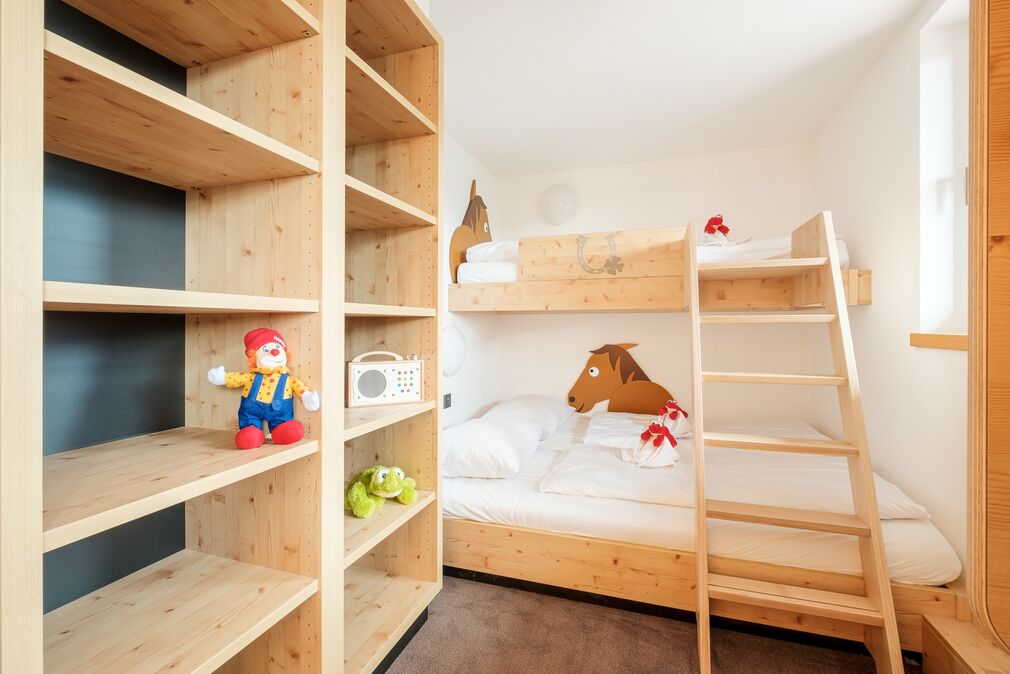 Familiensuite mit beschaulichem Wohn-Schlafraum für die Eltern. Kuscheliges Kinderzimmer mit Spielwiesenstockbett und genügend Platz für ein zusätzliches Gitterbettchen. Eingerichtet mit freundlich hellen Fichten-Einbaumöbeln und natürlichen beige-blauen Stoffen.