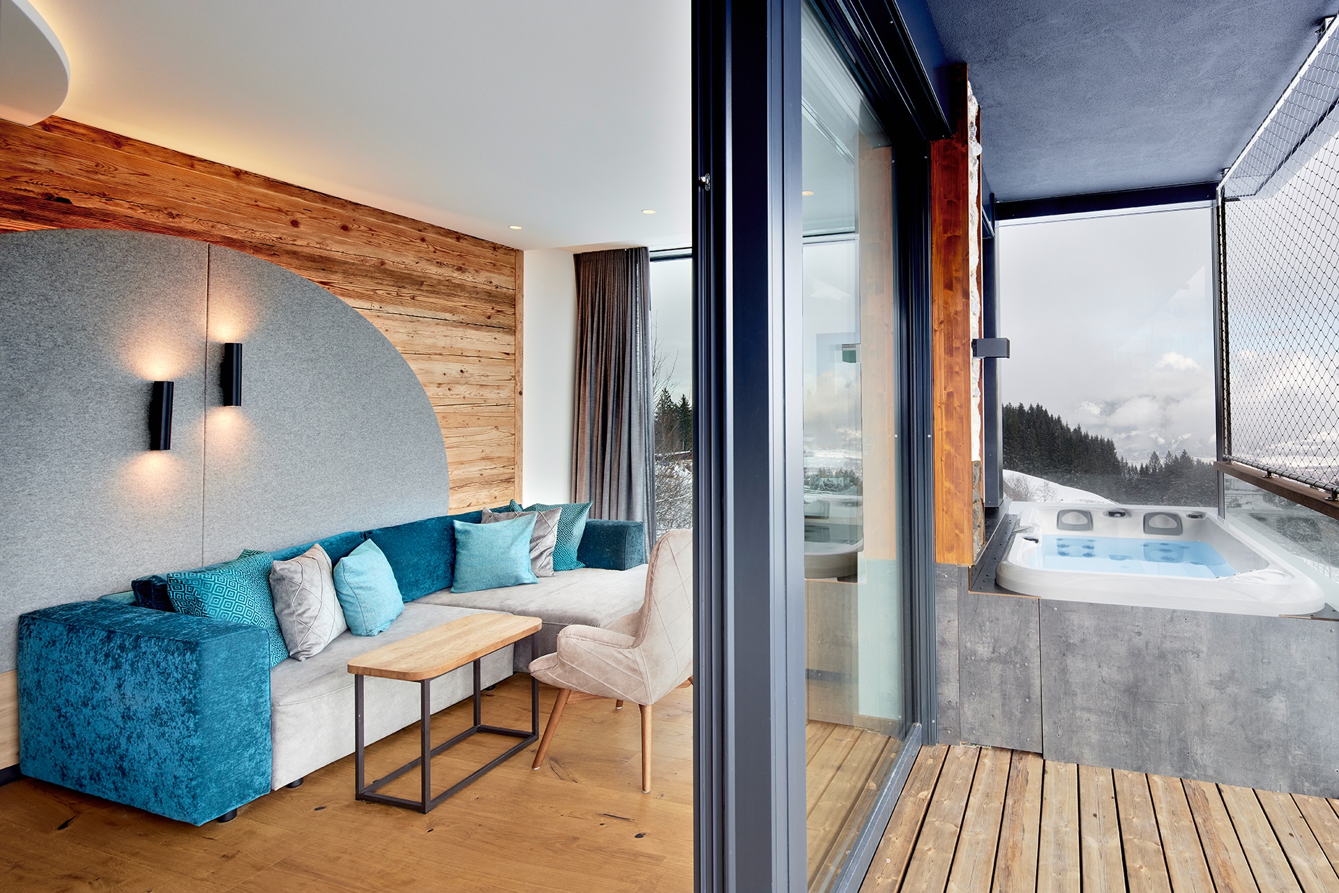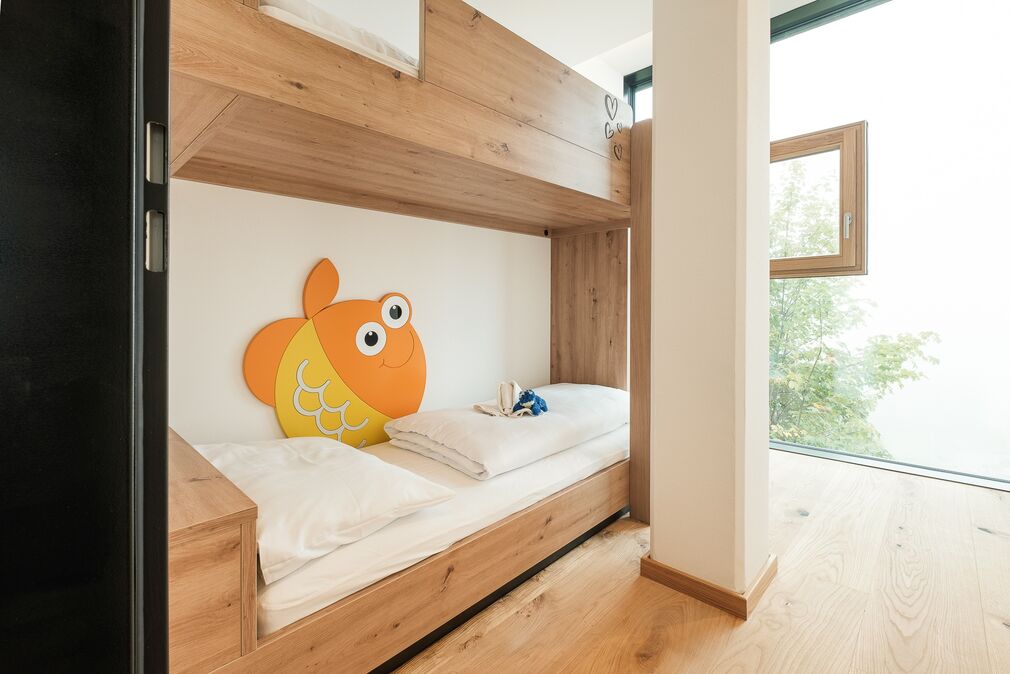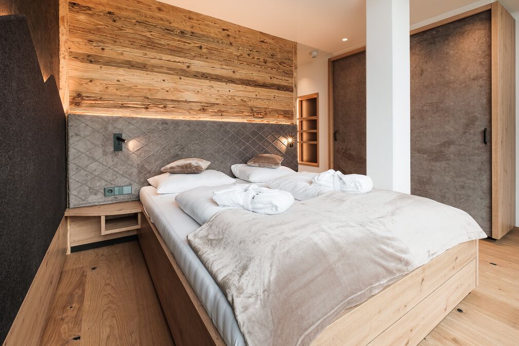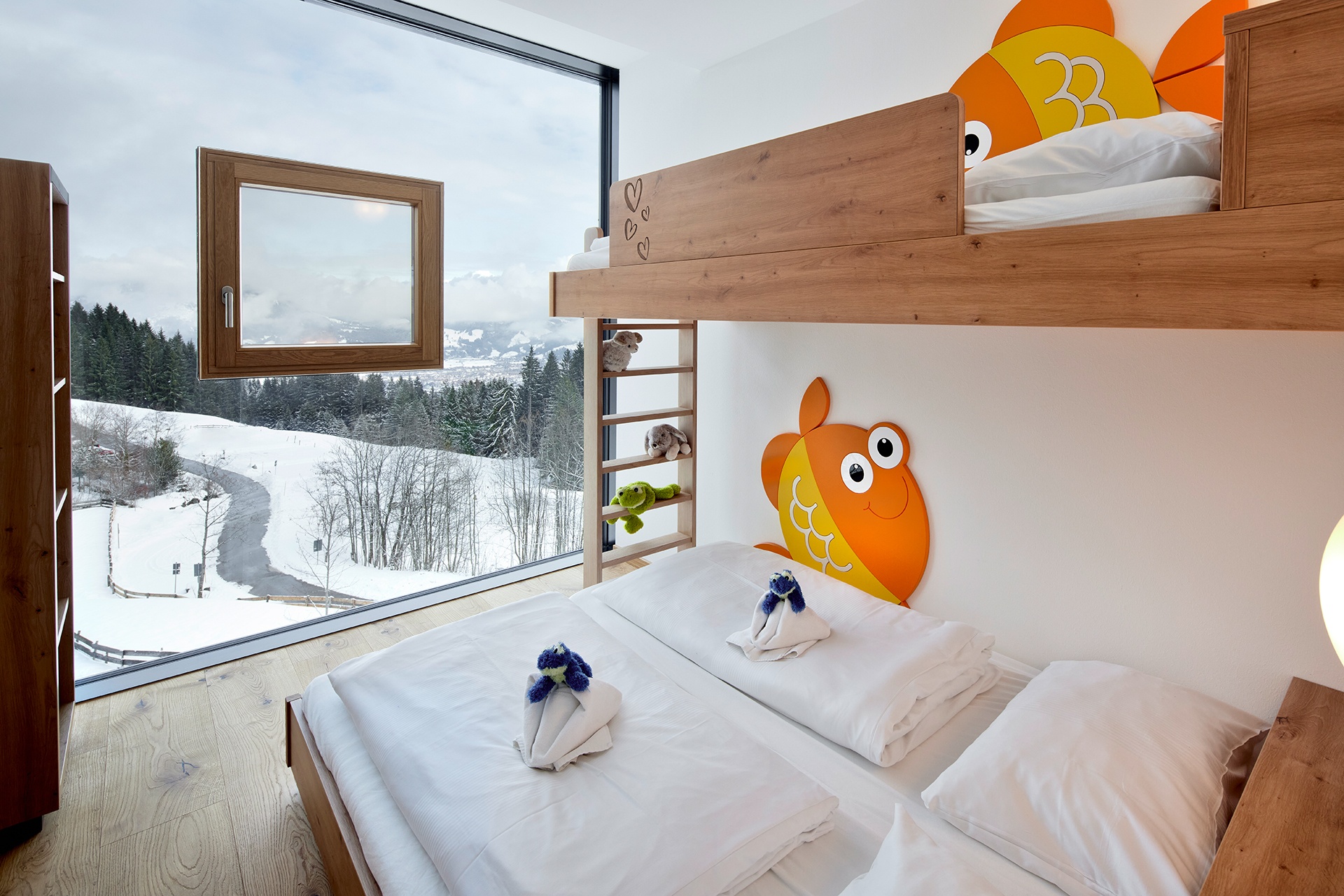 Luxuriöse Familiensuite mit großzügigem Wohnzimmer, Elternschlafzimmer mit eigenem Badezimmer und genügend Platz für ein zusätzliches Gitterbettchen, Kinderzimmer mit kuscheligem Spielwiesenstockbett sowie weiterem Kinderzimmer mit Stockbett und genügend Platz für ein zusätzliches Gitterbettchen. Stilvolle Einrichtung mit edler Wandgestaltung. Warmes Altholz, freundliche Fichtenmöbel. Stoffe in natürlichen Farben.