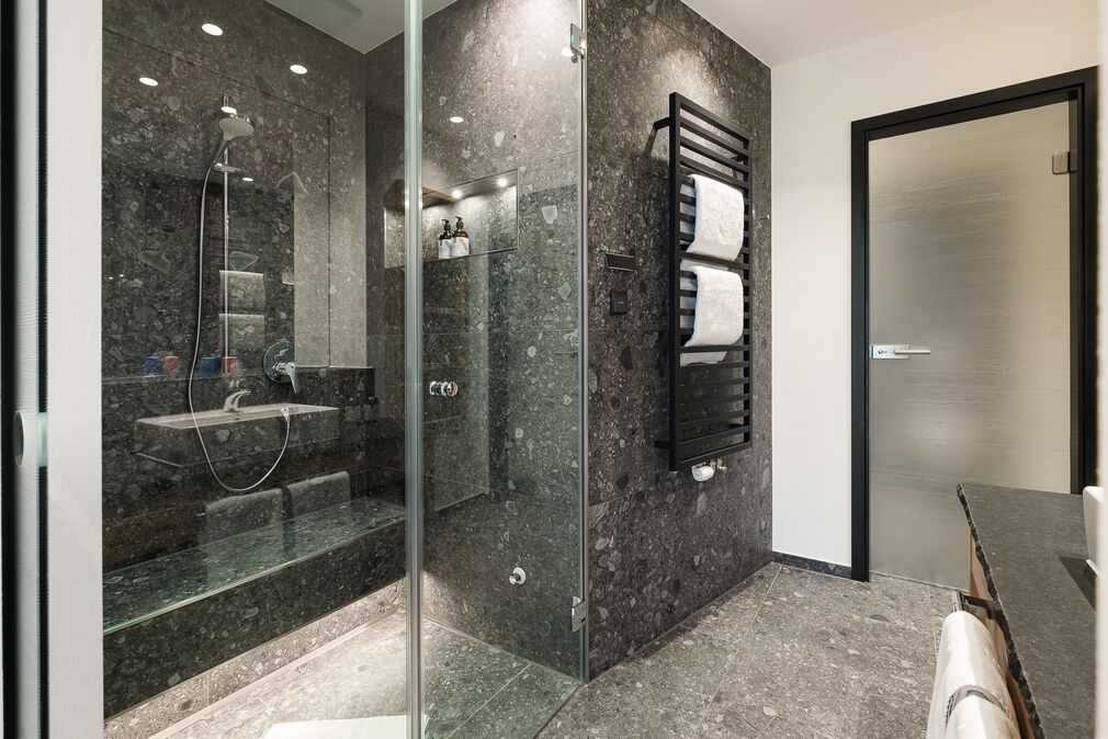 - Zweites, stylische-edles Eltern-Badezimmer mit Natursteinwaschtisch, Dampfdusche, separate Toilette.