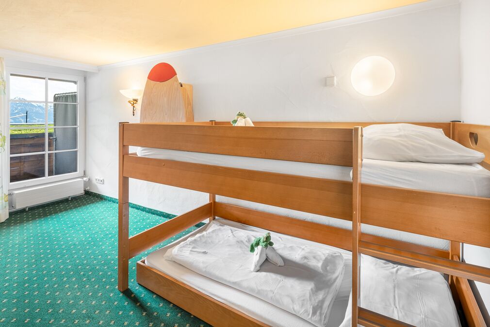 Familiensuite mit gemütlichem Wohn-Schlafraum für die Eltern. Kuscheliges Kinderzimmer mit Stockbett und ausreichend Platz für ein zusätzliches Gitterbettchen. Eingerichtet mit ehrlichen Vollholzmöbeln aus Buche.
